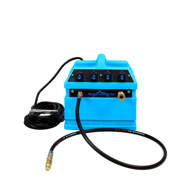 The Mytee Hot Turbo is a 2400-watt portable heater that can be hooked up to any cold water extractor to produce hot water. Switches allow you to select either 600, 1200, 1800, or 2400 watts of heat for 210 degree maximum heat.